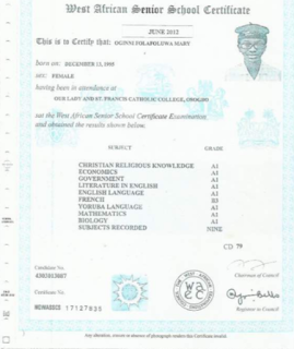 In 2013, 17-year old Folafoluwa Oginni emerged the overall best pupil in the May/June 2012 West African Senior School Certificate Examination (WAEC) when she scored the highest grade (Grade 1) in all her eight subjects, including English Language and Mathematics.