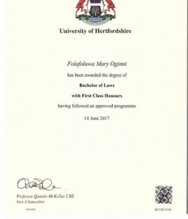 Fast forward to 2017, Folafoluwa kept the flag flying by becoming the best graduating student from theUniversity of Heterfordshire after she finished her Law degree without getting a B throughout her stay.