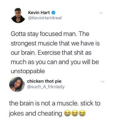 Seems people haven’t gotten over Kevin Hart cheating on his pregnant wife, Eniko, even after he publicly apologized to her. The comedian when replying a tweet yesterday said the strongest muscle that we have is our brain.