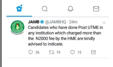 According to jamb twitter handle this morning have urge any student who’s currently running for Post UTME screening exercise to report any school that charge more then N2000 for the exercise