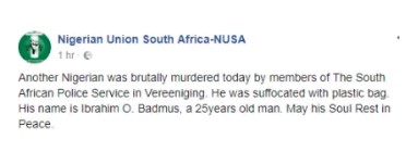 This is according to a post shared on the Nigerian Union South Africa Facebook page.