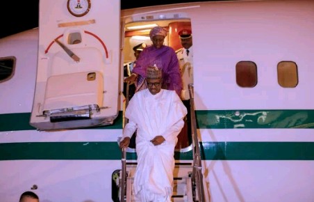 Buhari, accompanied by his wife, Aisha, was received at the airport by senior government officials, including his Chief of Staff, Abba Kyari, Inspector-General of Police, Idris Ibrahim, Minister of the Federal Capital Territory (FCT), Alhaji Mohammad Bello and other presidential aides.