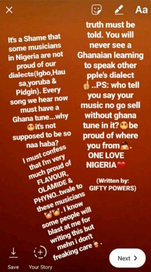 Former Big Brother Naija contestant, Gifty in this Snapchat post is calling out Nigerian celebrities for always using Ghanaian tune for their songs instead of our own local dialects.