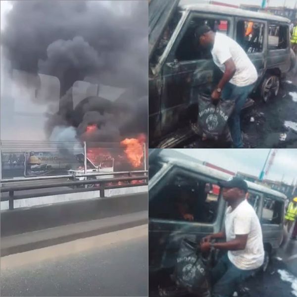 A traffic official and witness said the driver of the G-Class, who waited behind until the fire was put off, later went in to pack some burnt N500 notes and other items in the car.