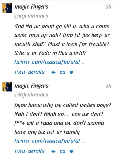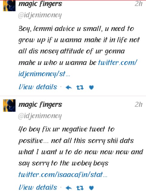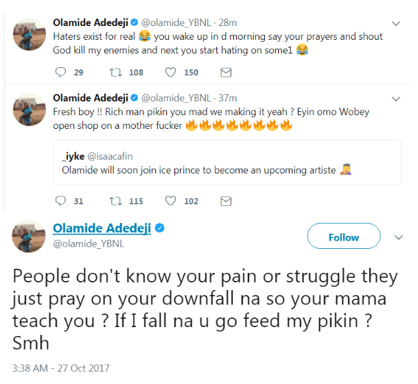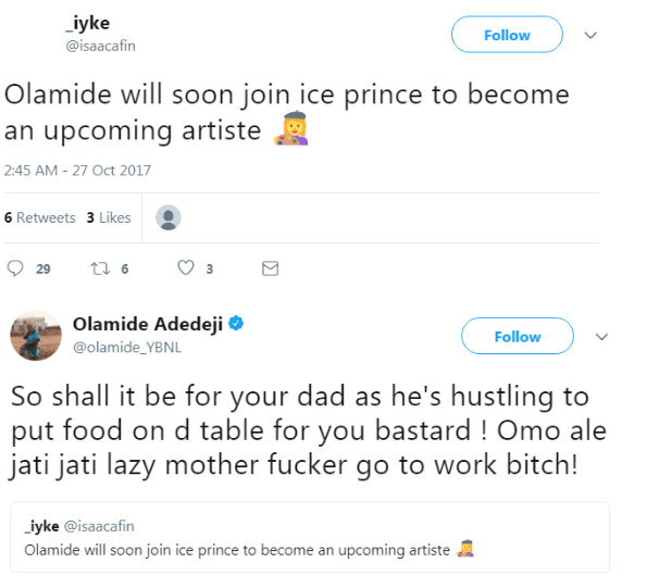 Olamideis definitely not here for haters.The rapper, took his time to severely slam a follower who probably is disappointed with the rapper’s current artistry prompting him to say he, Olamide, would return to being an upcoming act if care is not taken.Not one to take insults lightly, the YBNL boss, went all out on the follower.Read their exchange below: