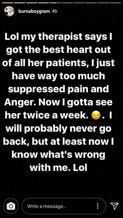 According to a snap by Burna Boy in his Instagram stories, the singer shared his experience when he visited a therapist recently.