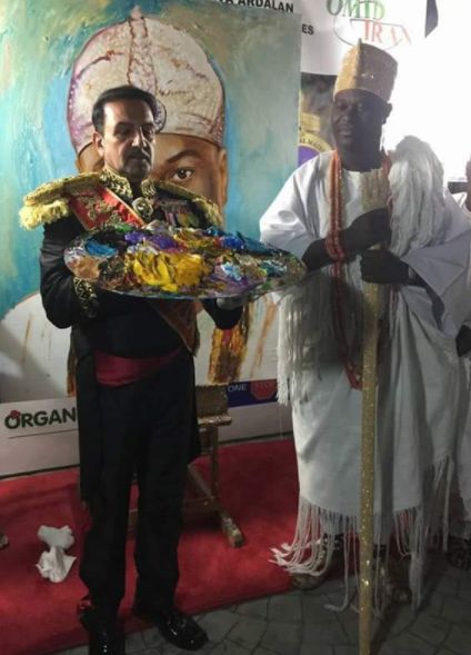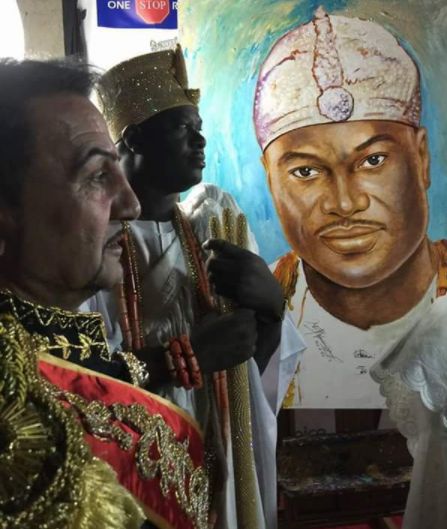 The foremost monarch from Nigeria, His Imperial Majesty, Oba Adeyeye Enitan Ogunwusi, Ojaja II, the Ooni of Ife pictured watching one of the world most brilliant and renown artist & painter – King of Cryptorealism – Artist Davood Roostaei and his creation Cryptorealism drawing and painting his picture with his hand and finger tip.