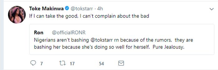 Toke has finally reacted to the claims via her twitter handle. and according to her she can not complain.